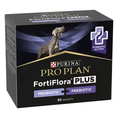 A PRO PLAN FortiFlora PLUS hatékony kombinációja az egyedülálló probiotikum törzsnek és a prebiotikumnak, mely bizonyítottan segít fenntartani a bél mikrobiomjának egészségét, elősegítve a hosszú távú egészséget. A benne lévő probiotikum támogatja a normál mikrobiom fennmaradását, az útifűmaghéj, mely egy növényi eredetű prebiotikus rost, segít megtartani a mikrobiom egészségét. A PRO PLAN FortiFlora PLUS minden méretű és életkorú kutyának adható (elválasztástól). Állatorvosok és társállat táplálási szakemberek által fejlesztett termék.